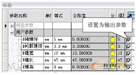 3. 啟用fx參數(shù)表,創(chuàng)建用戶參數(shù),輸入上述參數(shù)如圖1.2所示。需要注意的是要將輸出選項(xiàng)勾選,否則將不能關(guān)聯(lián)到軸零件中。