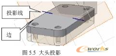 2. 連接部分兩端的幾何形狀外形與相應(yīng)的 零件相同,因此我們使用裝配體中的跨零件投影功能。在被連接物體的接觸面上創(chuàng)建一張草圖,并將這個(gè)接觸面投影在這張草圖上。如圖5.2所示。然后利用投影出來(lái)的輪廓直接拉伸,便得到了連接部分。如圖5.3所示。用同樣的辦法創(chuàng)建另外一端的連接部分。