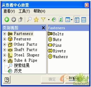 可查看被使用過的標準件;點擊“工具”菜單下的“搜索”可查詢自己想看見的標準件。需要注意的是,使用“收藏夾”會降低資源中心放置環境的啟動效率。