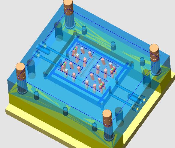 Cimatron E 的分模功能非常簡便直觀,對已設置好拔模角的產品, Cimatron E 只需設定分模方向就可以對曲面自動分配。對無需拔模角度的曲面, Cimatron E 可以指定屬性到前模、后模、行位或斜頂中。 Cimatron E 提供了方便、快捷的拔模角分析、倒勾分析工具、模擬分模過程。分模環境與 Cimatron E 的高級曲面功能無縫集成,便于復雜分型面的生成。 Cimatron E 的分模不必區分曲面、實體。針對客戶提供的其它格式的圖檔文件,各種設計軟件轉進來都存在數據丟失,圖檔出現縫隙、破爛面問題。有些設計軟件進行分模時必須將其補成實體,否則無法分模。 Cimatron E 在此問題上有獨到之處, Cimatron E 無需先將曲面縫成實體,針對存在縫隙、破面的圖素, Cimatron E 照樣可以進行分模。當然,如果一定要將曲面縫合成實體, Cimatron E 提供的強大的曲面構建和編輯功能。下圖中,只需對產品設定上下兩個分模方向,很快捷地將其分成前后模(斜頂部分先不處理),然后選取分模線功能,自動生成內、外分模線。通過分模線利用 Cimatron E 強大的曲面功能創建分模面。由于采用的是一模四腔結構,所以需要利用 Parting Surface 建立公共分模面。然后通過 Attach Attribute (分模屬性分配)指定公共分模面的屬性。