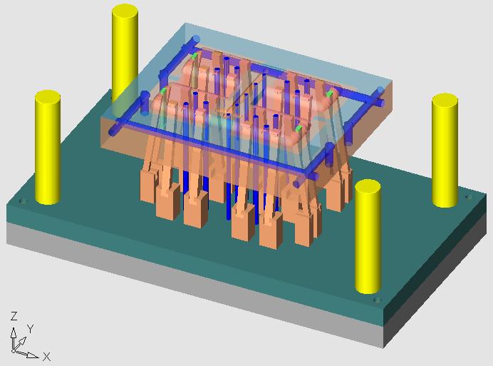 Cimatron E 的冷卻系統設計功能包含了一系列工具以簡化復雜的冷卻系統的設計。本例只需定義冷卻水道的平面,繪制水道的 2D 草圖,設定水道的直徑為 8mm 、水道端部延伸量為 4mm ,就可以生成 3D 的水道。當然如果在如 AUTOCAD 軟件上設計好了模具結構圖, Cimatron 同樣可以讀取其線架生成冷卻水道。水道生成后,直接載入相關冷卻系統的標準件,如插銷、連接裝置、隔板、管接頭等。 Cimatron E 提供精確的冷卻水道設計工具,確保冷卻水道的設計考慮鉆孔工具的準確形狀,包括鉆孔延伸和鉆孔尖端的特殊設計。
