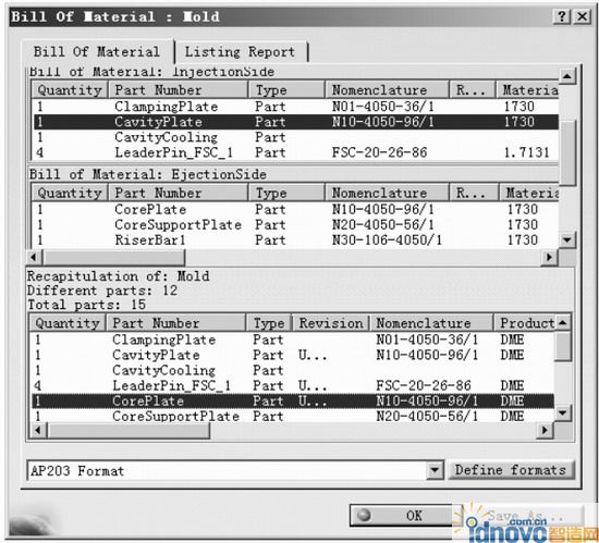 對設(shè)計完成后的模具元、部組件進行匯總輸出,同時可以網(wǎng)頁的形式進行輸出。圖4和圖5分別為手機模具設(shè)計完成后的凸凹模以及模具零部件的BOM匯總結(jié)果。