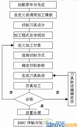 CATIA用于產(chǎn)品零件的數(shù)控加工,其流程一般如圖6所示。首先是調(diào)用產(chǎn)品零件、加載毛坯、定義刀具,然后選擇加工策略、定義工序、加工的對象來生成相應(yīng)的加工程式。用戶依據(jù)加工程式的內(nèi)容來確立刀具軌跡的生成方式,如加工對象的具體內(nèi)容、刀具的導(dǎo)動方式、切削步距、主軸轉(zhuǎn)速、進給量、切削角度、進退刀點、干涉面及安全平面等詳細(xì)內(nèi)容,生成刀具軌跡,待所有的刀具軌跡設(shè)計合格后,進行后處理生成相應(yīng)數(shù)控系統(tǒng)的加工代碼,并完成行DNC傳輸與數(shù)控加工。