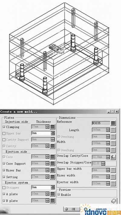 標(biāo)準(zhǔn)模架包括定模板(Clamping Plate)、上支承板(Upper Bar)、凹模型腔墊板(Cavity Support Plate)、凸模型芯墊板(Core Support Plate)、支承墊板(Riser Bar)、頂桿墊板(Ejection Plate)和動模底座(Setting Plate)等不同系列的標(biāo)準(zhǔn)部件,用戶只需對這些設(shè)計好的標(biāo)準(zhǔn)件進行細(xì)節(jié)設(shè)計,即可完成產(chǎn)品完整的注塑模具設(shè)計工作,這大大降低了模具設(shè)計人員的工作量,提高了注塑模具的設(shè)計效率和質(zhì)量。圖3是該手機模架的加載界面與加載完成后的示意圖。