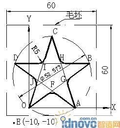 ①工藝分析:加工如圖2所示五角星外形,毛坯尺寸為60×60mm,對刀位置必須設在毛坯之外,以圖中E點坐標(-10,-10)作為對刀點,O點為起割點,逆時鐘方向走刀。
