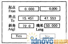 繪制“OB”直線:光標點取直線圖標,將光標移至B點,光標呈“×”形,拖動光標至O點(呈‘×’形),在彈出的直線參數窗中對參數進行修正,如圖6,按“Yes”鍵完成直線“OB”的輸入。