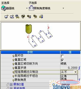 上圖(7)是為了保證尖角邊采用圓角連接的策略生成的刀路圖,給定一個(gè)選擇以后,系統(tǒng)會(huì)自動(dòng)的根據(jù)你的幾何形狀進(jìn)行數(shù)據(jù)運(yùn)算生成合適的刀路軌跡。當(dāng)然了,你也可以采用尖角的方式來(lái)過(guò)渡,因?yàn)樵谶@個(gè)策略中有3種方式可供選擇如下圖(8)所示: