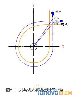 考慮刀具的進、退刀(切入、切出)路線時,刀具的切出或切入點應在沿零件輪廓的切線上,以保證工件輪廓光滑;應避免在工件輪廓面上垂直上、下刀而劃傷工件表面;盡量減少在輪廓加工切削過程中的暫停(切削力突然變化造成彈性變形),以免留下刀痕,如圖2.5所示。