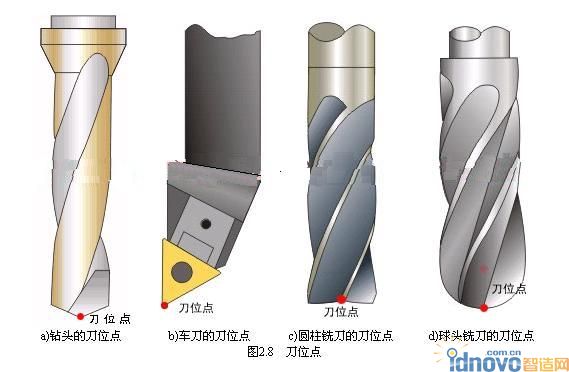 在使用對(duì)刀點(diǎn)確定加工原點(diǎn)時(shí),就需要進(jìn)行“對(duì)刀”。所謂對(duì)刀是指使“刀位點(diǎn)”與“對(duì)刀點(diǎn)”重合的操作。每把刀具的半徑與長(zhǎng)度尺寸都是不同的,刀具裝在機(jī)床上后,應(yīng)在控制系統(tǒng)中設(shè)置刀具的基本位置。“刀位點(diǎn)”是指刀具的定位基準(zhǔn)點(diǎn)。如圖2.8所示,圓柱銑刀的刀位點(diǎn)是刀具中心線與刀具底面的交點(diǎn);球頭銑刀的刀位點(diǎn)是球頭的球心點(diǎn)或球頭頂點(diǎn);車刀的刀位點(diǎn)是刀尖或刀尖圓弧中心;鉆頭的刀位點(diǎn)是鉆頭頂點(diǎn)。各類數(shù)控機(jī)床的對(duì)刀方法是不完全一樣的,這一內(nèi)容將結(jié)合各類機(jī)床分別討論。