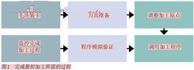 我們這里首選提出一個概念——數控加工程序的標準化。這里所說的“標準化”并不是簡單地定義加工程序的格式。而是指編制加工程序過程中,相關切削參數的設定、刀具的選用和刀具切削軌跡設計思路的標準化。我們為什么會有數控加工程序標準化這個想法呢?讓我們來看一下在數控加工過程中,哪些環節經常重復出現,而且容易出錯,那么這些環節就是我們進行標準化的著眼點。對于工藝流程最簡單的工件來說,完成數控加工需要圖1中的過程。