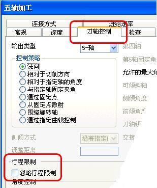 選擇五軸加工& #9658; 刀軸控制選項卡 & #9658; 忽略行程限制選項可以忽略行程限制。