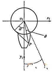 對于齒輪的數(shù)控插齒修形,由于只考慮齒廓修形,因此可簡化為二維數(shù)字化修形齒面與刀具齒面之間的共扼運(yùn)動[5]。如圖2所示,o-xy為固定坐標(biāo)系,o1-x1y1為與插齒刀相固聯(lián)的動坐標(biāo)系,o2-x2y2是與二維數(shù)字化齒面相固聯(lián)的動坐標(biāo)系,op-xpyp為輔助坐標(biāo)系,圖3表示插齒刀的齒形。在坐標(biāo)系o1-x1y1中,插齒刀上的任意一點(diǎn)坐標(biāo)P(x1,y1),該點(diǎn)處斜率為k1,在坐標(biāo)系o2-x2y2中修形齒面上的一點(diǎn)P’(x2,y2),該點(diǎn)處斜率為k2。當(dāng)插齒刀轉(zhuǎn)動φ1,被加工齒輪轉(zhuǎn)動時φ2時,P和P’處于共扼接觸。