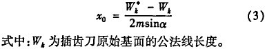 插齒刀是一組各段剖面為不同變位系數(shù)的變位齒輪的疊加,但插齒加工中起作用的是前端面。由于插齒刀在使用中前端面不斷磨損,因此在修形加工前要測出插齒刀前端面的實際變位系數(shù)??梢詫崪y出插齒刀前端面的公法線長度Wk,再由下式計算[6]。