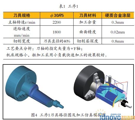 1.φ 30R 5圓鼻刀粗加工工序1的具體內容如表1所示。生成 的刀具路徑和加工仿真如圖4所示。