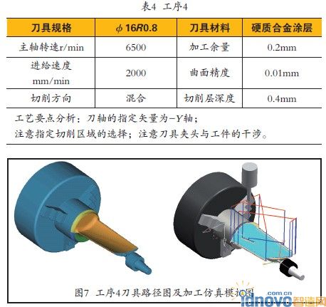 工序4的具體內容如表4所示。生成的刀具路徑和加工仿真如圖7所示。