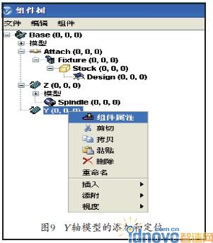 (5)銑床Y 軸造型的建立。同樣先構(gòu)建Y 軸。Y 軸也是和Base直接關(guān)聯(lián)。同理,在“Base(0,0,0)”中右鍵然后選擇“添附”→“Y線性”。如圖8所示。右鍵“Y(0,0,0)”,通過“組件屬性”,在“造型”中的“模型文件”中導(dǎo)入前后運動部件Y 軸模塊的建模文件。模塊之間的空間相對位置已在Pro/ENGINEER建模過程中計算并設(shè)定完成,定位相對于起點的坐標不需要再次改動。點擊“模型”選項中的“添加”,完成Y 軸模型的構(gòu)建。如圖9所示。