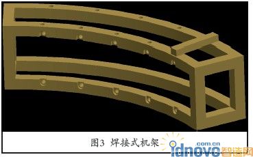 如圖3所示焊接式機架,正上方各孔已由龍門銑鏜床鉸削完成,并且各孔間位置精度滿足圖樣要求,現(xiàn)在落地鏜床上加工完成側(cè)面10個凹槽的加工。凹槽分布在彎板的內(nèi)圓弧面上,彎板半徑為2米,內(nèi)圓弧面未加工。工件尺寸太大,工作臺面積小,難以使圓弧中心與工作臺圓轉(zhuǎn)中心重合。