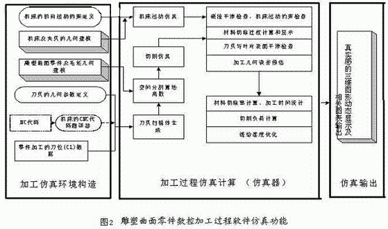 由于大型雕塑曲面零件的形狀復雜,盡管在數(shù)控編程時對各張曲面造型、工藝規(guī)劃、刀位規(guī)劃、后置處理等方面都作了非常仔細工作,但仍不能確保所生成的數(shù)控加工程序不存在任何問題。其中可能發(fā)生的問題有:加工過程中的過切與欠切、刀桿和聯(lián)接系統(tǒng)與零件、機床各運動部件與零件和夾具間的干涉碰撞,以及加工過程中切削刀具的過負荷等。在大型雕塑曲面零件數(shù)控加工過程中,這些問題常常是致命的,將損壞機床、刀具和工件,從而造成巨大的損失。因此,在加工刀位軌跡或者程序生成后,必須對其正確性進行檢驗,并針對其存在的問題進行修改,直到形成合格的零件程序。對于大型雕塑曲面零件加工,包括切削過程的幾何仿真和機床運動仿真。首先進行切削過程仿真,檢查加工過程中葉片的過切與欠切。為了機床和葉片的安全,進一步進行機床運動仿真以防機床運動部件碰撞和刀桿干涉等是非常必須的。如仿真中發(fā)現(xiàn)碰撞和干涉,必須修改加工方案或者加工方法。大型雕塑曲面零件數(shù)控加工是一個非常復雜的工藝過程,通過在計算機上的仿真加工,可以反復修改完善尋求合理的加工工藝規(guī)劃,優(yōu)化加工方案,優(yōu)化刀具的幾何參數(shù)和切削參數(shù)等。
