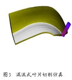 數(shù)控加工仿真技術是將葉片的真實加工過程在虛擬加工環(huán)境中進行映射,首先要求對采用的數(shù)控機床、加工刀具、零件毛坯及夾具等真實的加工環(huán)境進行映射構造出仿真(虛擬的)加工環(huán)境。數(shù)控加工仿真是通過軟件模擬加工環(huán)境、刀具路徑和材料切除過程,從而達到模擬數(shù)控加工過程的目的。在我們開發(fā)的大型水輪機轉輪葉片的五軸聯(lián)動數(shù)控加工技術中,考慮到葉片五軸聯(lián)動加工計算的復雜性及工程實際要求加工過程仿真計算的高可靠性。在SDRC/Camand®和CGtech/Vericut®上進行開發(fā)來實現(xiàn)大型水輪機葉片加工過程仿真功能要求,并且實現(xiàn)刀位軌跡計算與加工過程仿真的集成。刀位軌跡生成后可直接進行加工過程的幾何仿真。該仿真系統(tǒng)的功能如圖2所示,在該仿真環(huán)境中,采用數(shù)值算法獲取加工過程中機床、刀具和零件的關鍵幾何信息,通過對刀位(CL-Data)文件或者NC程序的翻譯,提取出加工過程運動驅動指令,根據給定的時間系列間隔,生成刀具掃描體,通過刀具掃描體與零件模型運算來反映零件的切削過程。通過該仿真系統(tǒng)可以反復修改完善尋求合理加工工藝規(guī)劃,優(yōu)化加工方案,優(yōu)化刀具的幾何參數(shù)和切削參數(shù)等,這已成為工程實際大型葉片數(shù)控加工編程過程中檢驗程序和優(yōu)化加工方案必不可少的手段。如圖3是對一大型混流式水輪機葉片進行切削仿真,如圖4 是對一大型軸流式水輪機葉片進行切機床運動碰撞干涉檢驗仿真,仿真在大型龍門移動式數(shù)控加工中心上加工。