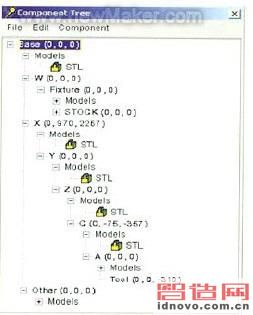 A.床身的建立選取菜單中Model-Component Tree或點擊快捷圖標別,彈出部件樹對話框,如圖2所示。選取菜單中Model->Model Definition或點擊快捷圖標,按順序操作,選取相應的STL格式文件,正確設置位置參數,點擊Add和OK選項后返回部件樹菜單。