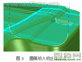 在進刀和退刀時采用圓弧切入切出的進退刀方式。為不要留下駐刀痕,提高加工表面光潔度和精度,在程序設計時,在切入和切出位置附加一段圓弧程序段,使該圓弧段在加工初始切削點處,與初始切削元素相切,這樣刀具以圓弧方式切入工件,保證被加工表面的光潔度,如圖3所示。