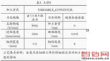 用φ10R5球頭刀除流道殘料加工。工序5的具體內容如表5所示。生成的刀具路徑和加工仿真如圖13、圖14所示.