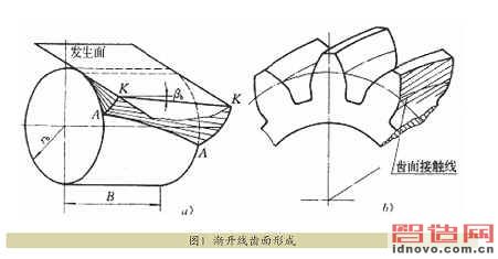 斜齒圓柱齒輪齒面形成的原理與直齒輪相似,如圖1所示,直齒輪齒面形成時(shí),直線kk與軸線平行,而斜齒圓柱齒輪面形成時(shí),直線KK與軸線有一個(gè)夾角βb ,發(fā)生生面沿基圓柱純滾動(dòng),發(fā)生面上與基圓柱軸線傾斜βb的直線KK所形成的軌跡,即為斜齒輪齒面,它是螺旋漸開面。