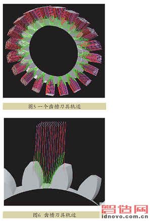 處,依次拾取進(jìn)刀點(diǎn)→加工側(cè)→走刀方向,注意加工曲面方向?yàn)辇X槽方向,即三個(gè)曲面箭頭方向應(yīng)如圖4所示,如有不同可以通過點(diǎn)選箭頭起點(diǎn)處改變加工方向;確定后點(diǎn)選鼠標(biāo)右鍵得到加工刀具軌跡如圖5所示;最后將一個(gè)齒槽的刀具軌跡沿YOZ平面內(nèi)陣列復(fù)制得到全部的齒槽刀具軌跡,如圖6所示。