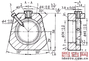 襯套以φ410-0.34外圓和臺階環形面C定位。以臺階環形面C定位,保證2—φ4+0.160孔中心與臺階環形面距離尺寸3.8±0.2mm。使用時用虎鉗鉗口夾住鉆模座1端面G和襯套大端面。鉆模上φ34+0.15+0.05孔是為了襯套在鉆孔后可能有毛刺不好取時,可從孔的左端往右端推出。在鉆模上鉆出第一個φ4+0.160孔后,松開鉗口,將襯套轉80°,再插入定位銷3,夾緊后鉆第二個孔,從而保證了兩孔軸心線之間夾角為80°。