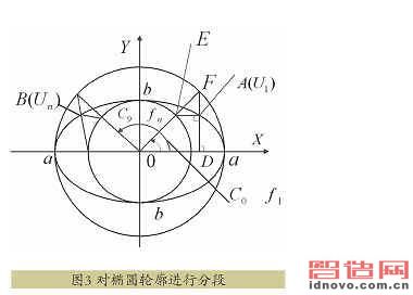 對(duì)需要加工的那段橢圓作等分,如圖3所示。在AB上沿逆時(shí)針?lè)较蛉↑c(diǎn),依次為U1,U2,…,Un。一種取法是讓相鄰兩點(diǎn)間的x向距離相等,然后用橢圓方程算出各點(diǎn)的y值。這種取法的缺點(diǎn)是各區(qū)段弧長(zhǎng)相差甚大,而且曲線段越長(zhǎng)的區(qū)段的曲率變化越大。
