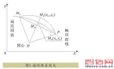 弧段來(lái)獲得最高的逼近精度。如能把每段逼近圓弧與橢圓間的距離限制在1μm之內(nèi),那么由編程引起的理論誤差就可以忽略不計(jì)了。編制如此精密逼近的數(shù)控加工程序,關(guān)鍵是作等誤差逼近計(jì)算。只要算出每個(gè)逼近圓的數(shù)據(jù),編寫加工程序就很方便了。