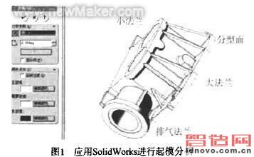 另外,利用SolidWorks動態修改尺寸這一功能,可快捷地實現加工面"加工余量"、砂芯留"間隙"的操作。常用的還有"組合"這一工具,通過多個實體的加、減、并邏輯操作,可將鑄件模型轉換成砂芯、外模、芯盒等三維造型。還有"分割"工具,可將一個實體用曲面或平面分割成多個實體,可用于模擬芯盒分邊,外模脫活塊等。