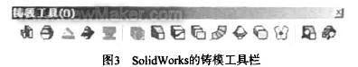 SolidWorks中有一系列的鑄模工具。圖3中的各工具的功能依次為:比例縮放,用于按指定的因子縮放模型;分型線,用于建立分型線以將核心和型腔分離;關閉曲面,用于查找并生成模具關閉面;分型面,用于在核心和型腔面之間生成分型面;切削分割,用于切削分割特征;型腔,用于插人一個型腔到基體零件中;起模,使用中性面或分型線按所指定的角度削尖模型面;分割線,將草圖投影到彎曲面或平面,從而生成多個單獨面;等距曲面,使用一個或多個相鄰的面來生成等距的曲面;直紋曲面,從邊線插人直紋曲面;延展曲面,從一條平行于一基準面的邊線開始來延展曲面;平面區域,使用草圖或一組邊線來生成平面區域;縫合曲面,將兩個或多個相鄰、不相交的曲面組合在一起;起模分析,根據模具起模方向分析面的起模角度;底切檢查,識別形成底切的面。