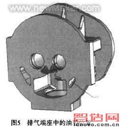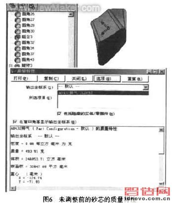 圖5為我公司某型號的排氣端座,圖面朝向的大面為排氣面,其所對的背面接增速箱,因設計條件的限制,排氣溫度較高,為降低機器運行時溫度,不致影響使用性能,機體、排氣端座、吸氣端座上均開設有油腔,油在其中循環,以帶走熱量.為了使散熱良好,面積應盡量大,流動阻力盡量減小,為此綜合多方面的考慮設計了如圖的兩個油腔。左右的油腔均由砂芯形成,但右邊的油腔制造起來時有不少困難,首先,它在兩個端面上的形狀變化較大,因油腔與一進油孔相連,又要求它離小法蘭面一定的距離內形狀不能變化,否則無法與油孔相連。我們用放樣這一特征按上述要求做出了砂芯的模型,設置為不與基體合并,再通過邏輯減在基體上減去,這樣便生成了鑄件的模型,通過退回控制棒,可隨時退回到砂芯的狀態。下面我們通過質量特性來檢查此砂芯是否能放置平穩,圖6中深色的區域為砂芯的底面,如果整個砂芯的重心落在深色區域,則砂芯可平穩放置;反之,則下芯后無支撐時砂芯將會傾斜。考慮到此處結構緊湊,靠近轉子孔這一重要位置,原則上不使用芯撐,以免對局部造成不良影響。我們將采取措施對砂芯本身進行處理,以求在滿足要求的前提下達到放置平穩的目的。