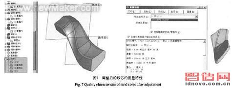 放樣就是通過在輪廓之間進行過渡生成特征。未調整前的砂芯就是通過放樣特征形成的。為了達到在離小面一定距離不變形的要求.在離小面一定距離的平面上插入了一個與小面形狀一致的面,讓大面、小面、插人面上的截面均作為放樣截面。現在為將重心平衡過來,在離大端面一定距離的平面上再次插人一放樣截面,添加到現有放樣,即讓大面形狀在一定距離內也保持不變,現在再次對調整后的砂芯應用質量特性,我們看到,已初步起效,重心移到了深色的底部支撐區域內了,如圖7所示。當然,圖中的效果還不是很理想,還需繼續對此砂芯進行細調,可以將大面保持的距離再增大一些,或將靠大面的平面上的截面形狀向右下移動,以作進一步的平衡,達到較佳的受力情況。理論上分析后,在模型制作時做了嚴格要求,此鑄件已完成,效果良好。