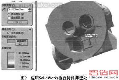 SolidWorks Utilities中的厚度分析可分析零件中不同的厚度值,識別薄區和厚區,并確定零件中與指定目標厚度相等的部分。進行薄區識別時,輸入分析參數,即符合強度、剛度條件、工藝要求的最小壁厚,系統將顯示小于最小壁厚的警戒值,通過不同顏色區分,一目了然。進行厚區識別時,輸人最小壁厚值作分析參數,再輸人一個認為過厚的壁厚,系統將以不同顏色顯示各厚度范圍,可從中看出熱節區的分布(一般是較醒目的紅色區域),壁厚是否均勻(均勻的壁厚各處的顏色基本是一致的)。