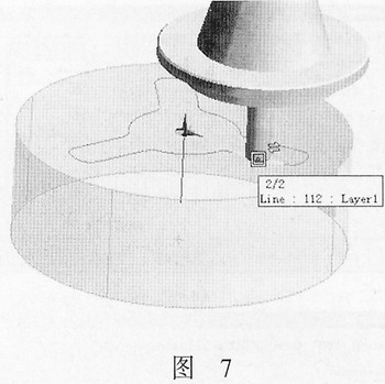 (3)選擇加工輪廓線 用鼠標左鍵在圖形工作區中捕捉輪廓線,將鼠標置于目標輪廓線上,按鍵盤上的Tab鍵,可以切換元素,直到目標元素被選中(高亮顯示)。然后可以雙擊鼠標左鍵,與該段直線相連的所有鏈接輪廓線將被自動選中。也可以將毛坯層關閉,方便選擇輪廓線,見圖7。選中輪廓后按鼠標右鍵或回車鍵確認。