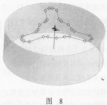 此時,在輪廓線的某個端點上,出現一個黃色箭頭,此箭頭代表了加工的起點,用鼠標左鍵在已顯示的紅色端點上點擊,可以改變起點的位置。將起點調整至圖8所示的位置上,然后按鼠標的右鍵或回車鍵確認。