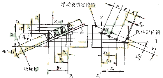 圖2是夾具原理圖。為了使汽缸蓋噴油孔的軸心線與機床主軸平行,夾具的工件裝夾平面(以下稱主平面)與其底面成(90°-U)夾角,汽缸中心連線在夾具主平面內逆時針方向轉V角度。加工程序的工件坐標原點(X,Y)設定在第一個噴油孔軸心線與夾具主平面的交點上,在此處開有環表找零點的工藝孔。Z方向的零點設在夾具頂面,夾具頂面與第一個噴油孔孔口面平齊,既可簡化Z坐標計算,又便于機上對刀確定刀具長度。一只圓柱定位銷固定不動,幾只菱形定位銷分別浮動,根據汽缸孔數量,確定使用哪一只菱形定位銷。夾具主平面和其上所有孔,在具有分度工作臺的臥式加工中心上一次裝夾加工完畢,以保證加工精度。確定工件零點和定位銷相對位置尺寸的x13、x13分別計算如下:
