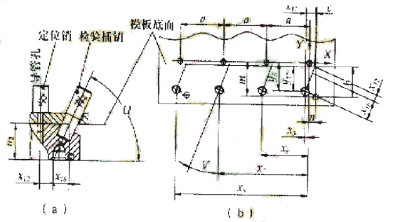 噴油孔的位置檢驗,用兩只定位插銷穿過檢驗模板在導管孔內定位,另一只檢驗插銷逐個插檢噴油孔的位置,如圖4所示。噴油孔的位置精度和坐標尺寸均為自由尺寸要求,在加工中心上加工能適當提高坐標精度,把被提高部分的坐標精度和自由位置精度一并考慮,利用補償原則確定檢驗插銷的合適直徑。檢驗模板上孔的坐標尺寸計算為