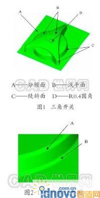 (一)曲面特點:如圖1所示,三角開關是一個比較典型的零件,曲面的外形尺寸50x60x15.6mm。圖形的上部分曲面比較平坦,在 MasterCAM中稱之為淺平面,如圖1-B處,這種曲面適合選擇平行刀路。下部分曲面陡峭,在 MasterCAM中稱之為陡斜面,如圖1-C處,這種曲面適合選擇等高刀路。曲面與曲面之間是R2mm的圓角過渡。曲面最上面D處的局部放大圖如圖2所示,此處圓角半徑為R0.4mm ,高度是1.15mm。