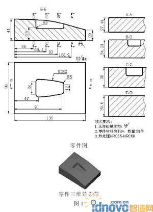 圖1為所要加工的凹模零件圖和三維圖形。在運用M as-terCAM軟件對零件進行數控加工自動編程前,首先要對零件進行加工工藝分析,確定合理的加工順序,在保證零件的表面粗糙度和加工精度的同時,要盡量減少換刀次數,提高加工效率,并充分考慮零件的形狀、尺寸和加工精度,以及零件剛度和變形等因素,做到先粗加工后精加工;先加工主要表面后加工次要表面,先加工基準面后加工其他表面。