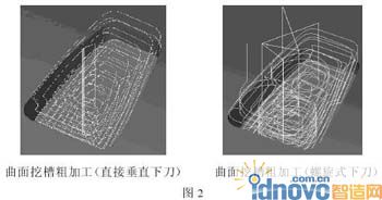加工方式:根據下刀方式不同可選用兩種———曲面挖槽粗加工(直接垂直下刀,配合第一種下刀方式進行)、曲面挖槽粗加工(螺旋式下刀,配合第二種下刀方式進行),圖2是兩種加工方式的刀具路徑。經對比分析,不難發現前一種方式相對后一種來說,具有路徑清晰、走刀路程短、下刀切入點容易控制等優點,下刀方式選用第一種,加工時選用直接垂直下刀的曲面挖槽粗加工的加工方式更合理。
