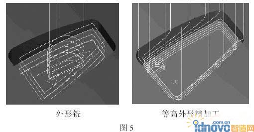 加工方式:可選用兩種———外形銑、等高外形精加工,圖5是兩種加工方式的刀具路徑,經對比分析,不難發現前一種加工方式相對后一種來說,有路徑清晰、走路程短、內槽側面切入點處可以用切線切入等優點,故選擇外形銑加工方式更合理。