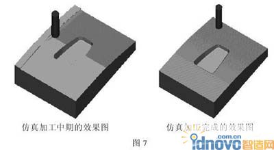 設置好刀具加工路徑后,利用M asterCAM系統提供的零件加工模擬功能,能夠觀察切削加工的過程(如圖7所示),可用來檢測工藝參數的設置是否合理,零件在數控實際加工中是否存在干涉,設備的運行動作是否正確,實際零件是否符合設計要求。同時在數控模擬加工中,系統會給出有關加工過程的報告。這樣可以在實際生產中省去試切的過程,可降低材料消耗,提高生產效率。