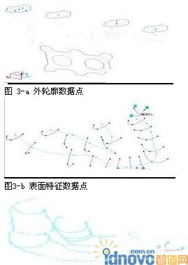 將三坐標測得的以上數據點分別以igs格式存檔,在Cimatron CAD造型環境中對各數據點文件進行坐標旋轉保證坐標原點及坐標軸向一致,然后進入Cimatron逆向工程軟件Re-Eng環境中,調入各數據點文件,確定斷點后完成數據點文件的合并,然后返回Cimatron CAD造型環境中進行編輯,將這些分散的點連成SPLINE曲線,用BLEND功能將SPLINE曲線構成曲面,得到如圖4圖形。內腔采用等壁厚處理,經過光順處理后得到圖2數字產品模型,該數字產品模型經格式轉換后可供快速成型機使用.