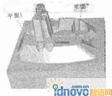 PLANAR MILL 及CAVITY MILL 是規(guī)定二軸聯(lián)動(dòng)的加工模塊,可規(guī)劃刀具平面輪廓運(yùn)動(dòng)及加工精度,并提供了用點(diǎn)、線、棱邊、面進(jìn)行驅(qū)動(dòng)的刀具軌跡計(jì)算方式。對PLANAR MILL 而言,進(jìn)行刀軌計(jì)算時(shí)只需要構(gòu)成加工對象的線或棱邊即可。如圖1所示平面1 及平面2 就很適合用該加工模塊編制其數(shù)控加工程序。應(yīng)用CAVITY MILL 模塊進(jìn)行加工計(jì)算時(shí),必須有表征零件三維數(shù)據(jù)的數(shù)學(xué)模型,同時(shí)還需要構(gòu)造Boundary(邊界) 或Blank Geome2try(毛坯體) 等要素。如圖2 所示內(nèi)腔的刀軌路徑可用該模塊進(jìn)行精確規(guī)劃,我們可以采取圓柱平底銑刀以自上而下的分層環(huán)繞方式去除毛坯多余材料并最終成型其內(nèi)腔型面。
