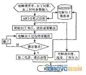 電解加工參數(shù)影響電解加工精度,加工參數(shù)包括電解液類型、濃度、溫度、加工進(jìn)給速度、加工電壓、工作壓力等.加丁參數(shù)優(yōu)化首先在建立的電解加工數(shù)據(jù)庫(kù)上利用神經(jīng)網(wǎng)絡(luò)智能工具進(jìn)行加工模式識(shí)別選擇初始的加工電壓、進(jìn)給速度,再采用模擬工具對(duì)初選的電解加工參數(shù)進(jìn)行模擬,修正參數(shù),以獲取最優(yōu)的電解加工參數(shù).電解加工參數(shù)優(yōu)化過(guò)程如圖4所示.