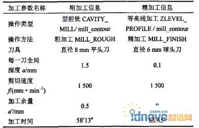首先考慮支撐模型的做法。支撐模型應該省時、經濟、實用,試驗中采用代木作為支撐模型,在加工人面部模型之前首先要在機床上加工出支撐模型??紤]到板料的厚度,直接對建立的人面部模型內偏置一個板料厚度,用于生成支撐模型的加工代碼模型,然后生成加工代碼。加工支撐模型的程序只需要三軸的加工程序即可,具體加工信息如表l所示。