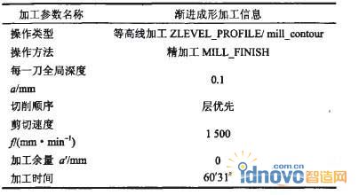 然后生成用于人面部漸進成形加工的刀具軌跡。漸進成形的刀具軌跡的產生思想是模擬模型的精加工,即加工余量設為零。UG中的CAM模塊沒有專門用于模擬板料擠壓成形的刀軌,根據漸進成形的過程特點要求程序要按照層加工進行,只有加工完上一層后才能進入下一層進行加工,因此在加工選項里面要選擇“層優先”,這與銑削加工的深度優不一樣。生成的三軸加工程序詳細信息如表2所示。其他的加工代碼信息與三軸銑中的設置相似。